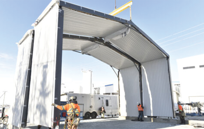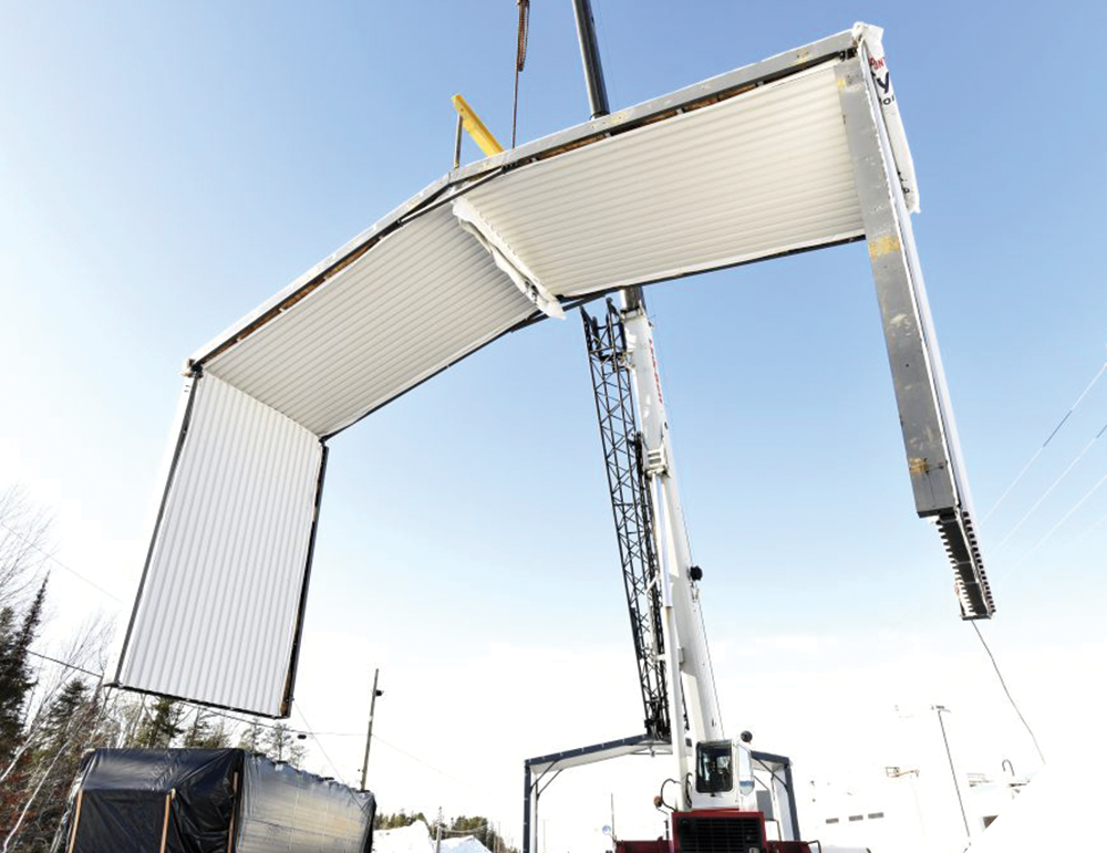 The four-panel section is placed on the foundation. Only 48 hours are needed to install the six sections of a 40 ft x 60 ft (12 m x 18 m) building.