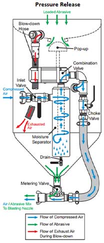 A Pressure Release blast pot simply means that when the blasting operator releases the deadman handle to stop blasting, the pressure inside the pot that drives the air and abrasive is released into the surrounding atmosphere. This “depressurizes” the blast pot completely. This depressurization requires a bit more time to cut-off the flow of air and abrasive than a pot that retains pressure. Likewise, it takes a bit longer, once the operator reactivates the deadman, for the pressure to build in the pot to facilitate the flow of air and abrasive to the nozzle to resume blasting.
