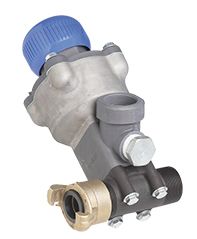 At the core of a pressure-release blast pot is this deadman valve called the combo valve and the reason is was the first valve in the industry to combine both the inlet which you see on this side and the outlet which you see on the other side into one valve.