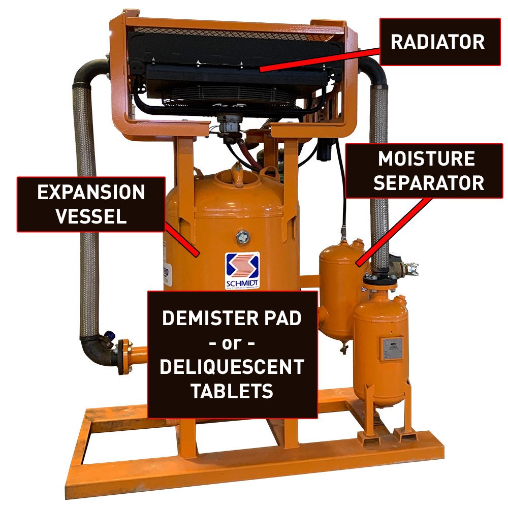 PHASE 2: Air coming from the compressor is extremely hot. Around 200 degrees F /90 degrees C. After passing through the inlet moisture separator, it then runs through a radiator to help cool it. Cooling the air causes water vapor to condense into water molecules. We want the vapor to condensate because that’s how we’re going to separate it from the air in the next phase.
