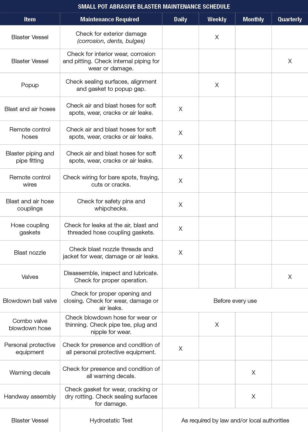 Important: The maintenance schedule provided below outlines the minimum requirements for daily inspection and upkeep. If you notice anything unusual during your checks, service your blasting equipment immediately to avoid further complications.