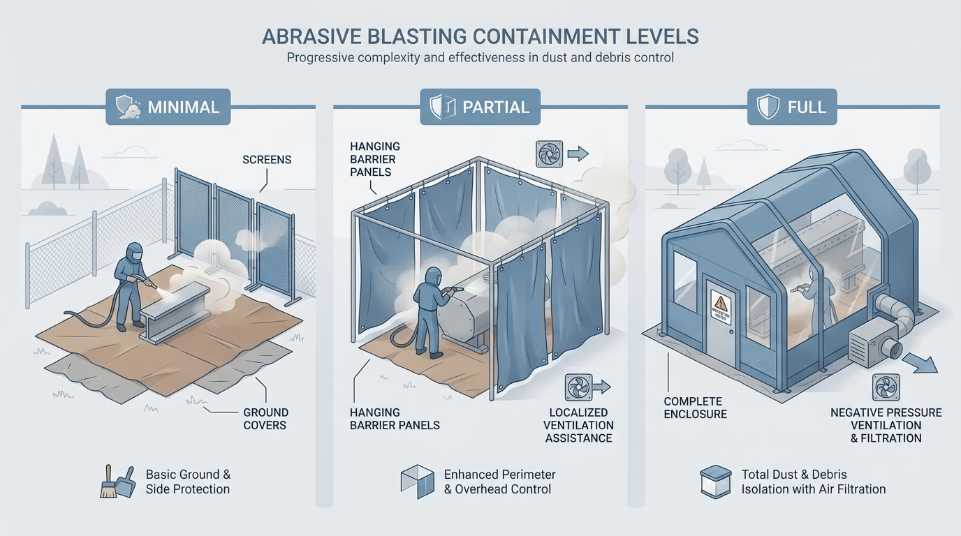 Basic containment may consist of ground tarps and perimeter screens. Collects debris for cleanup and provides minimal dust suppression. Best suited for non-hazardous coatings or open-area work.