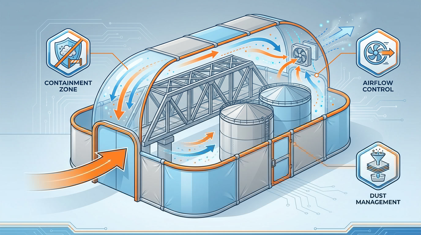 Containment is an essential component of any abrasive blasting project. Proper containment systems protect the environment, safeguard workers and the public, and maintain surface cleanliness for optimal coating adhesion. Many projects—especially bridges, water tanks, pipelines, and shipyards—are legally required to use containment systems to meet environmental standards.