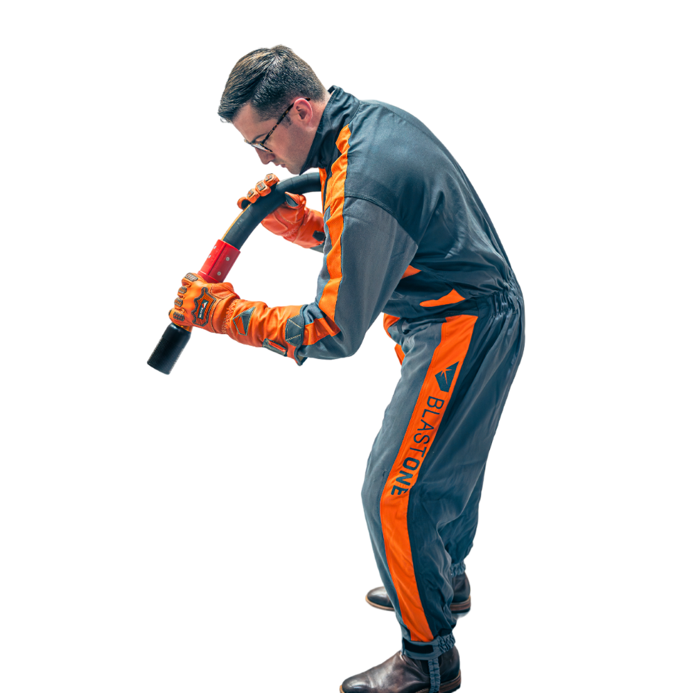 Introducing BlasterAlls, the ultimate protective blasting suit designed by blasters, for blasters. Made with tough and durable nylon construction, this suit offers excellent body protection against abrasive ricochet during blasting, while also allowing good breathability for the operator. The nylon/cotton construction of the BlasterAlls suit ensures that the frontal body areas are fully protected, while the breathable cotton chest provides comfort and breathability. The suit is also- operator friendly, with boot and hand loops that keep the arm and leg sleeves securely in place.