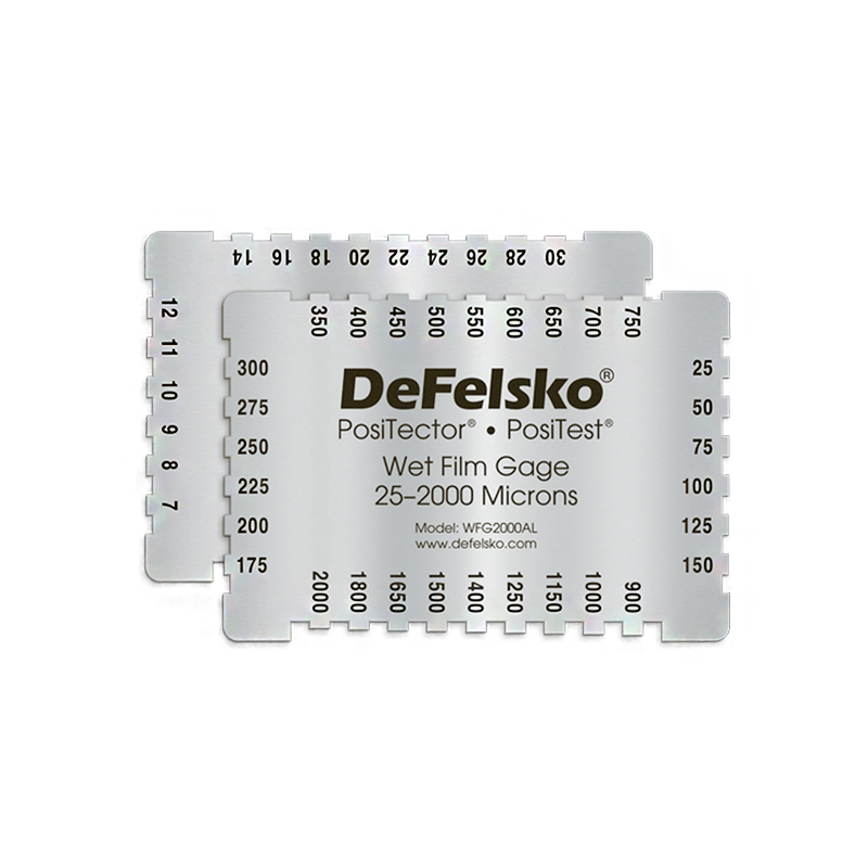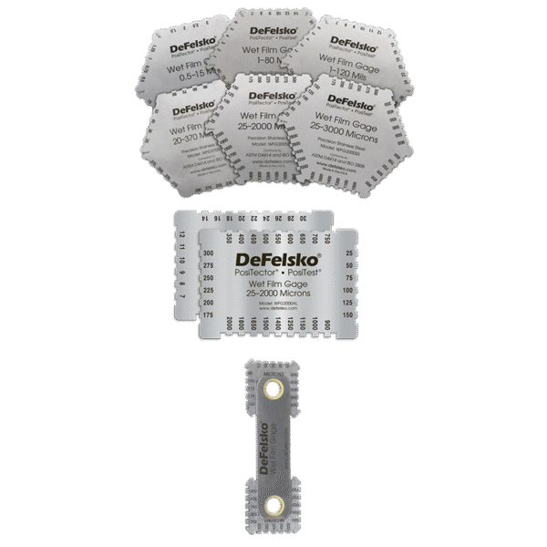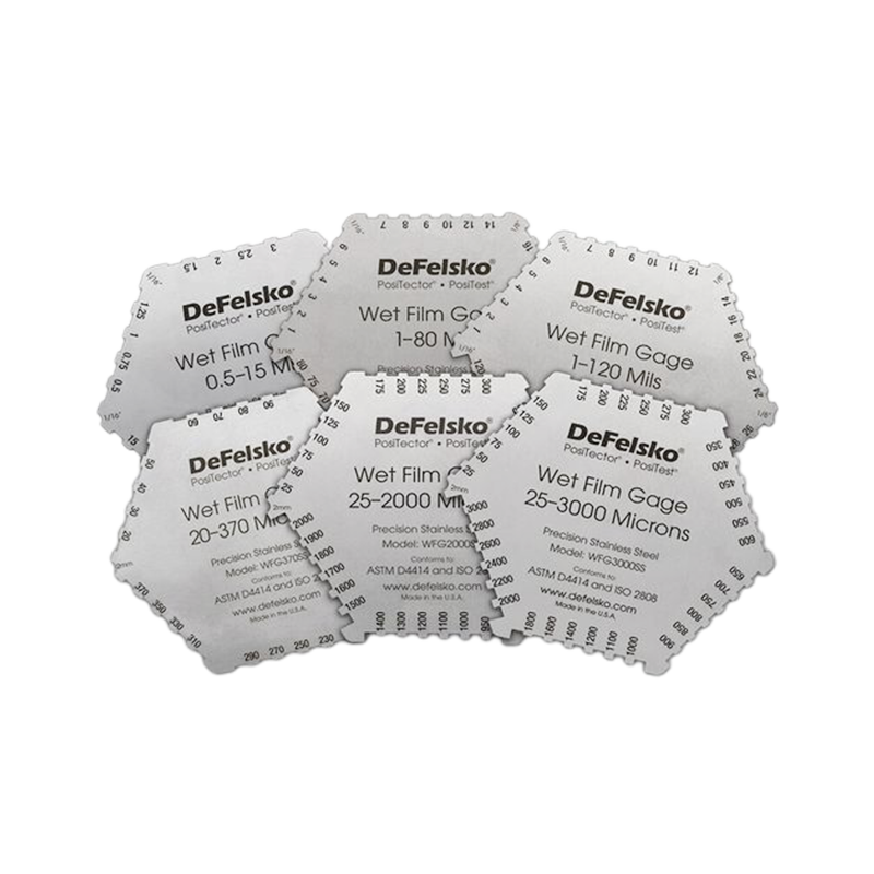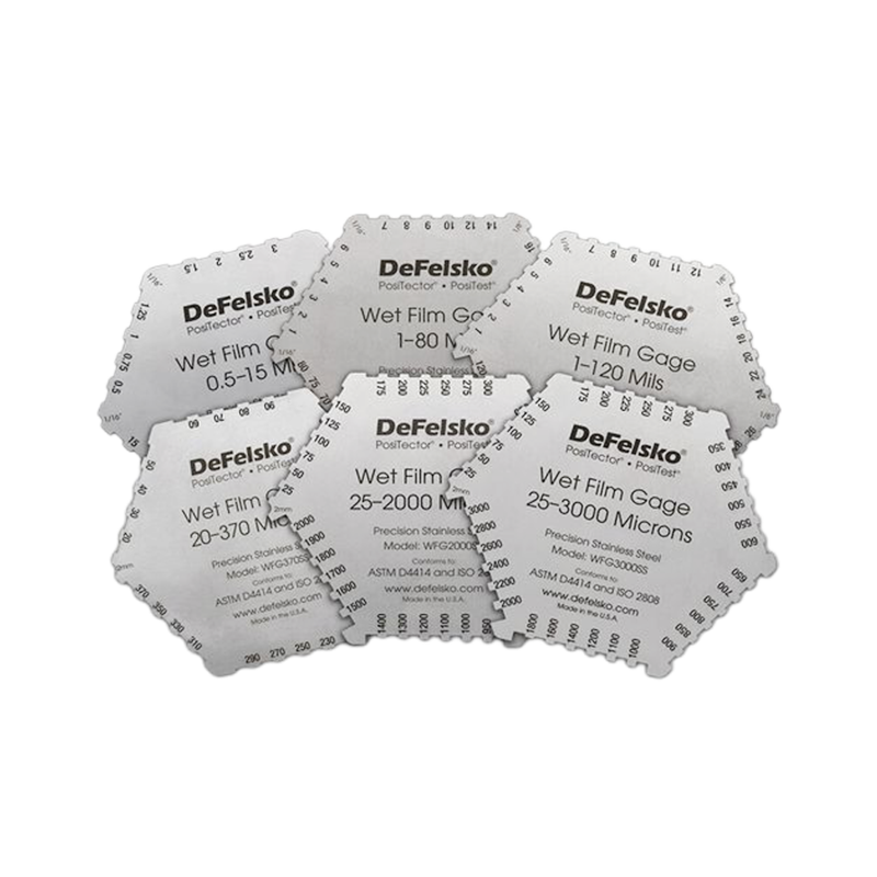 - The Stainless 6-Sided Wet Film Thickness Gages are available in multiple ranges, measuring coatings from 20 µm to 3,000 µm (0.5 to 120 mils). These are made of durable stainless steel, ideal for a wide range of professional applications.