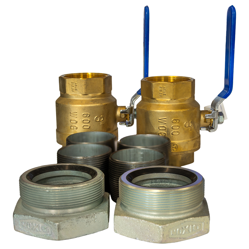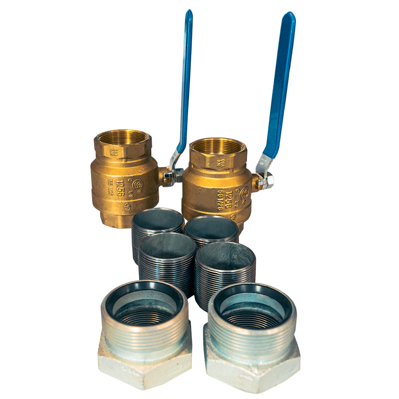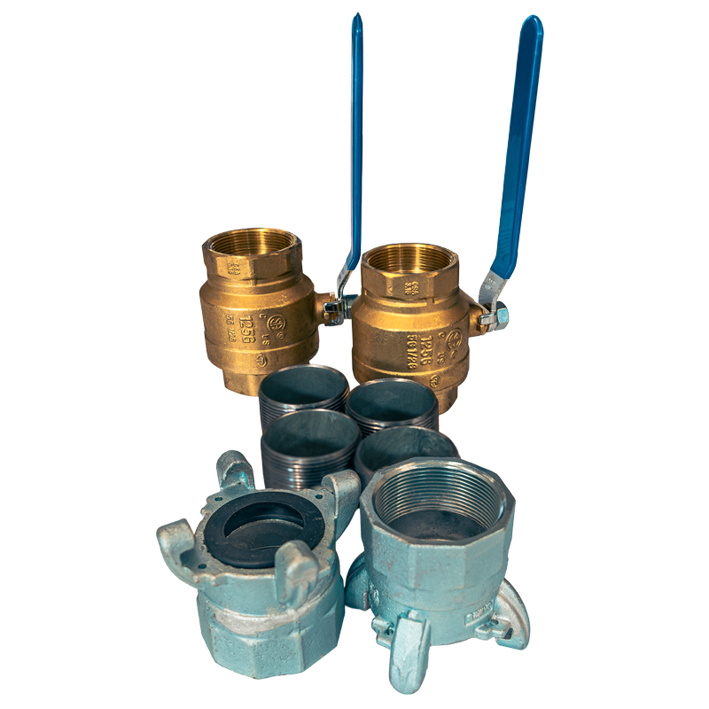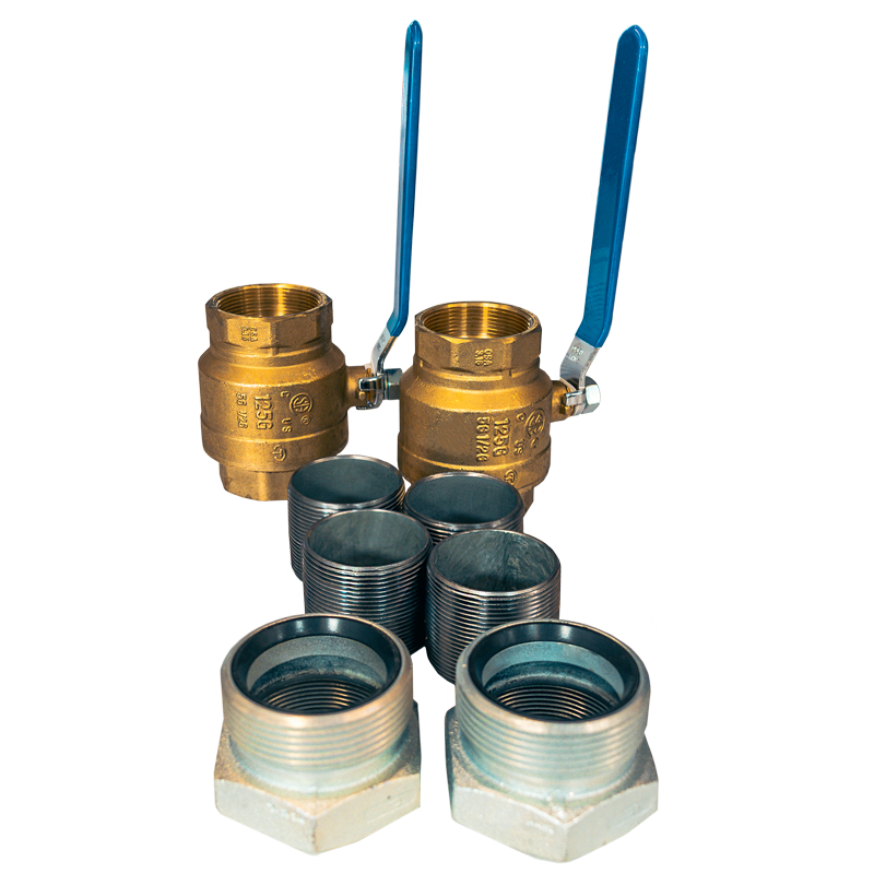 BlastOne Fitting Kits for Air Dryers provide all the hardware needed to connect and plumb your air dryer system. Since every contractor has their own hose setup preferences, BlastOne supplies air dryers without pre-installed fittings, letting you choose the exact configuration that fits your system. Each kit includes two connection fittings, two size-matched brass shut-off ball valves, and four matching pipe nipples. Choose from 2-inch with 4-Claw fittings, 2-inch with Spud (Boss®) fittings, or 3-inch with Spud fittings. The 2-inch versions can be configured for either Spud or 4-Claw connections. These fitting kits make installation fast, clean, and leak-free.- Includes two fittings, two brass shut-off valves, and four pipe nipples