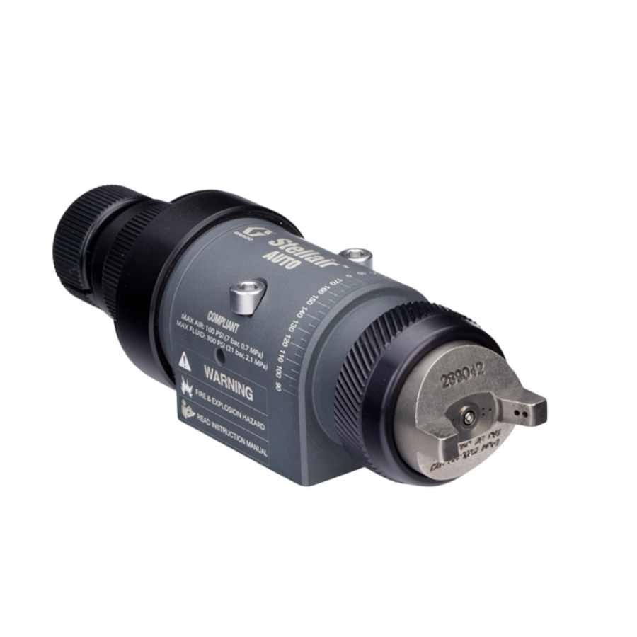 Every Stellair model includes precise fluid control with a click knob and true zero setting when selected. The patented spray pattern alignment tool makes pathing adjustments simple and repeatable. A one piece fluid cartridge drops out quickly to reduce maintenance downtime. The stainless steel fluid path lowers solvent use during flushing which cuts cleanup time and reduces VOC output.