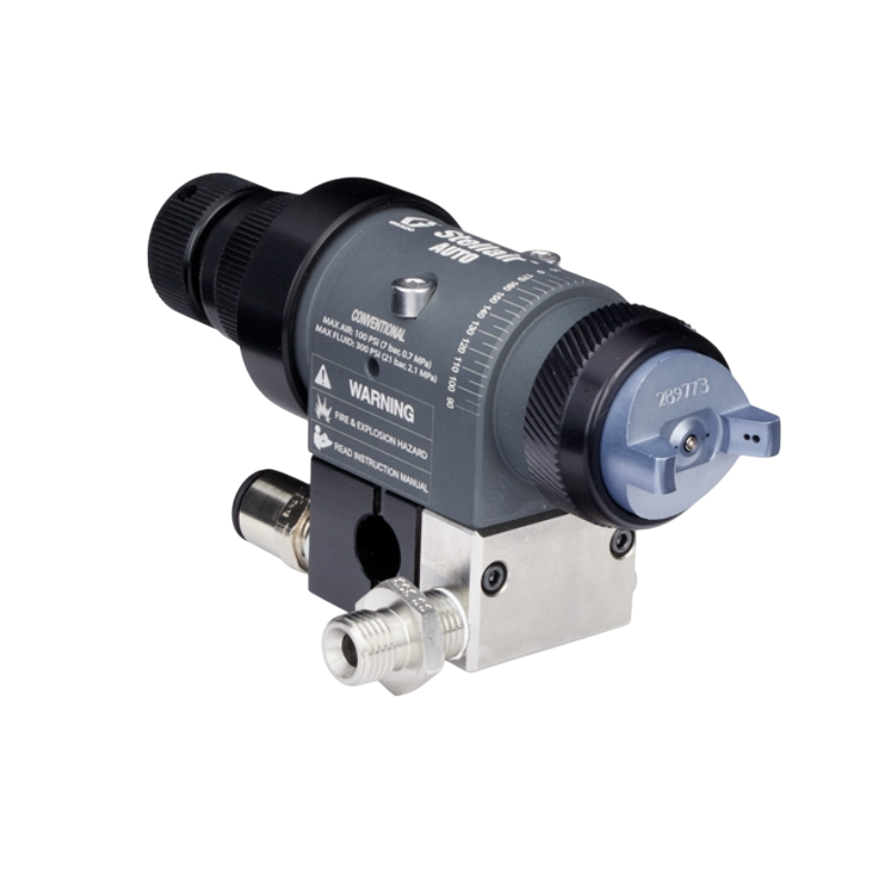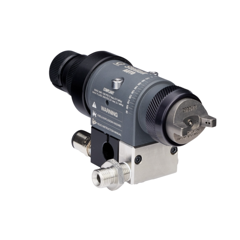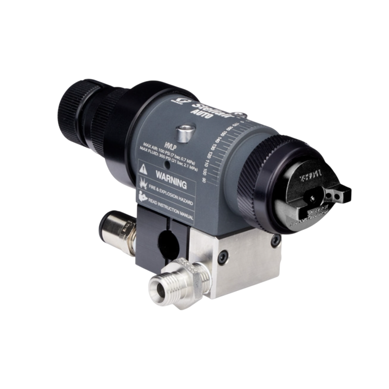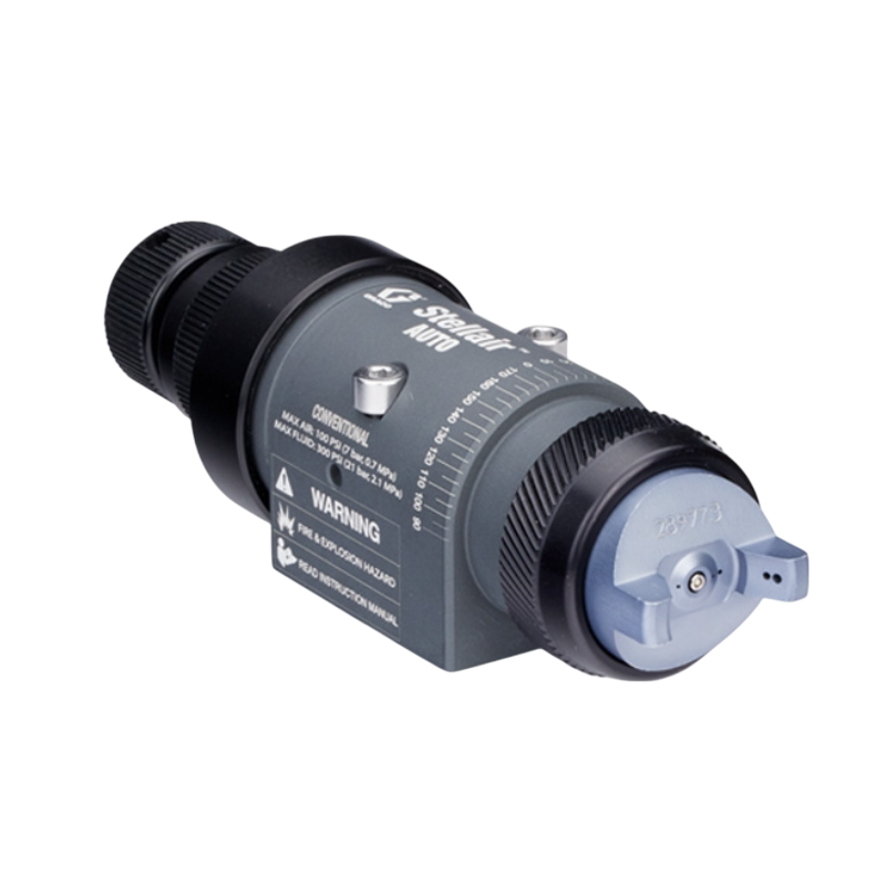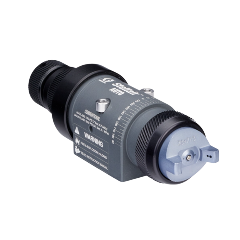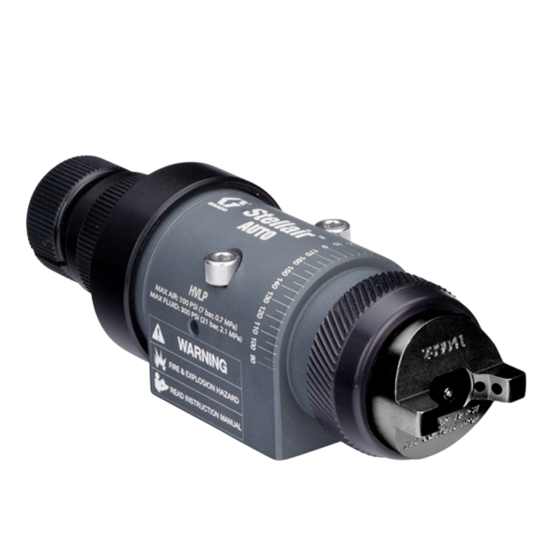 Graco Stellair Automatic Air Spray Guns are built for automated finishing lines and come in Conventional, HVLP, and Compliant versions. These guns deliver high quality spray patterns for general industry, adhesive, trim, air brush, and high solids coatings on automotive parts, industrial metal and plastic, wood products, and architectural components.