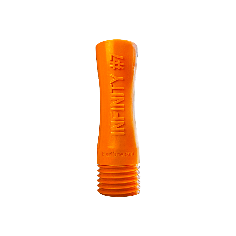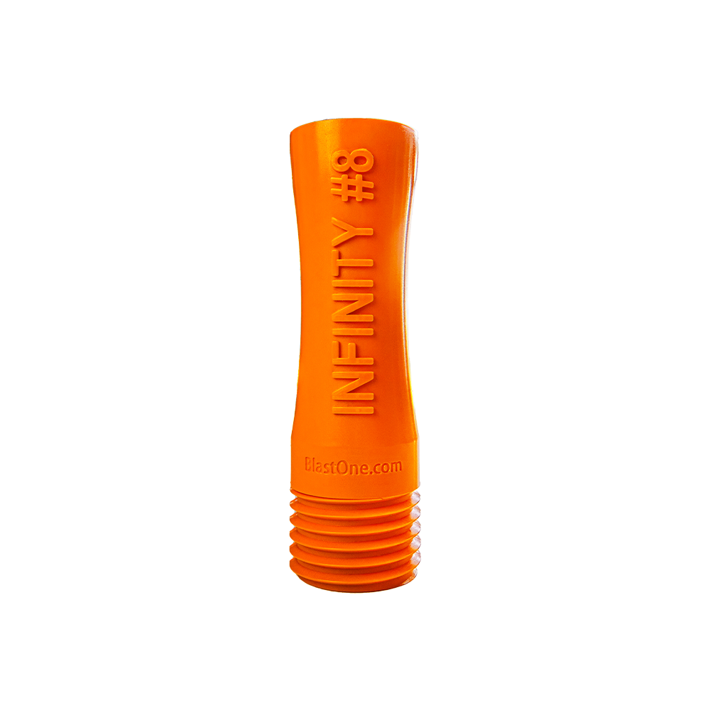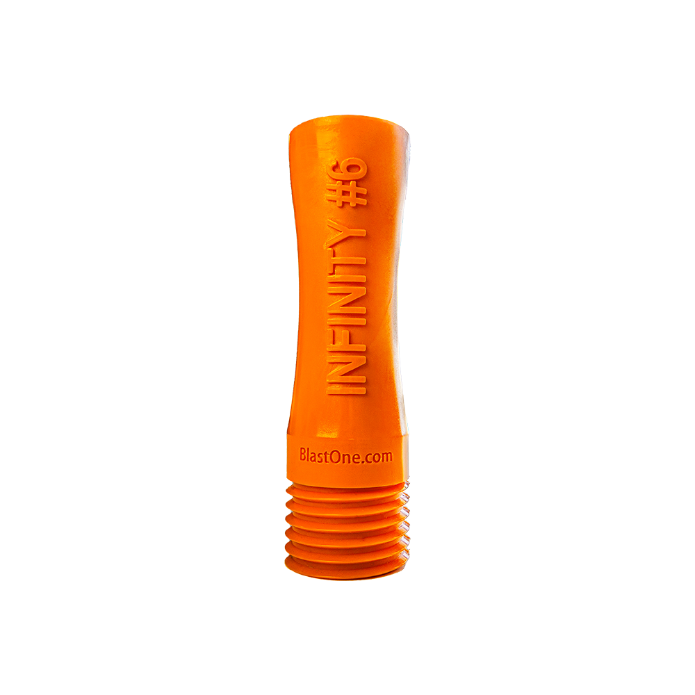 From the creators of the industry-changing SnakeBite silenced nozzle, BlastOne introduces the Infinity Nozzle—the latest evolution in abrasive blasting technology. Designed as a general-purpose nozzle for all industrial applications, it delivers reliable performance and superior durability for contractors and fabricators alike. At 6 inches in length, it's built for everyday use in confined and open blasting environments. The Infinity Nozzle’s proprietary design creates a more stable jet-stream of air and abrasive, resulting in a highly consistent blast pattern and more efficient abrasive flow. Paired with a shock-resistant urethane outer layer and jam-resistant contractor threads, this nozzle combines long wear life with dependable performance in the field. Available in multiple orifice sizes, the Infinity is BlastOne’s next-generation solution for general blasting excellence.- BlastOne proprietary nozzle design – engineered for performance