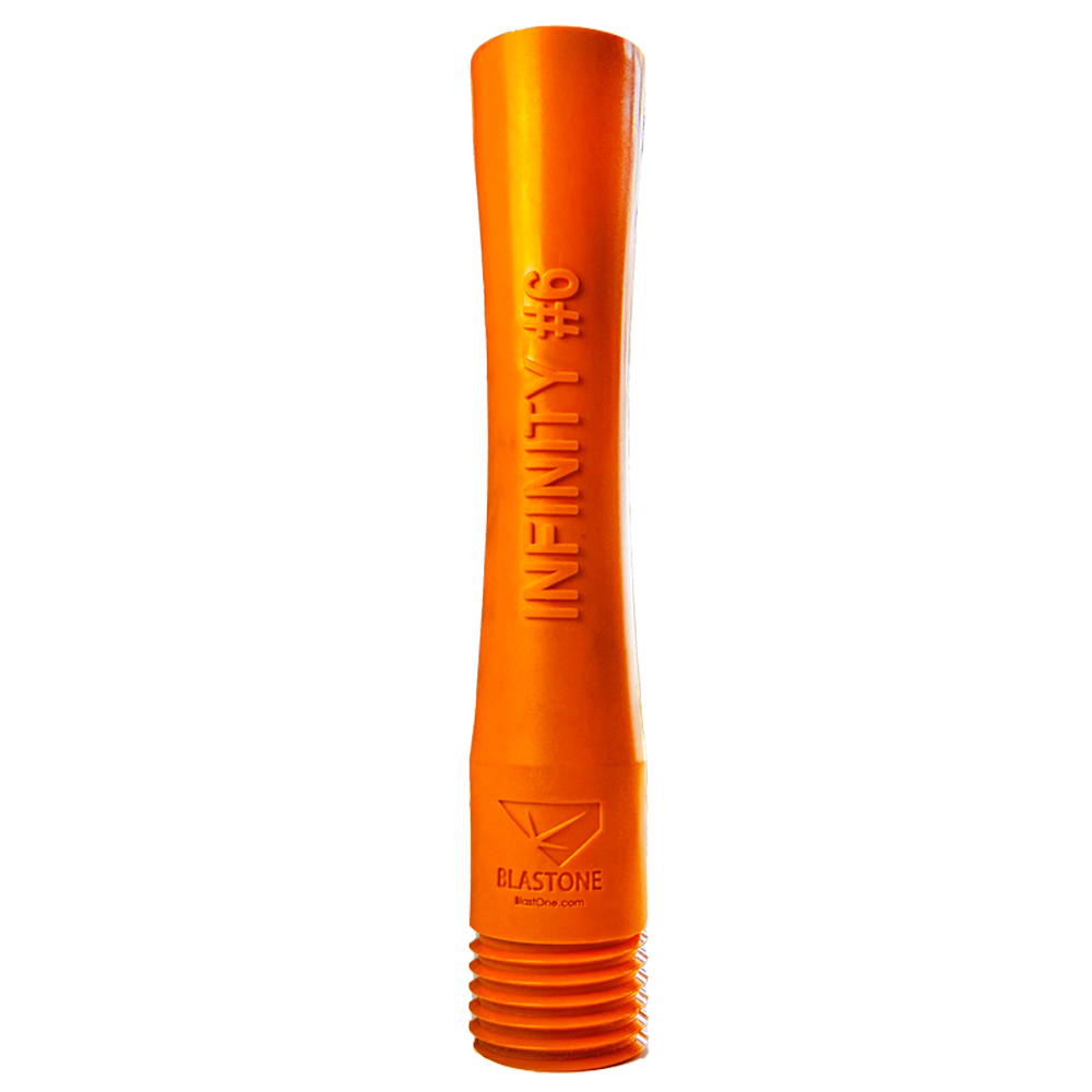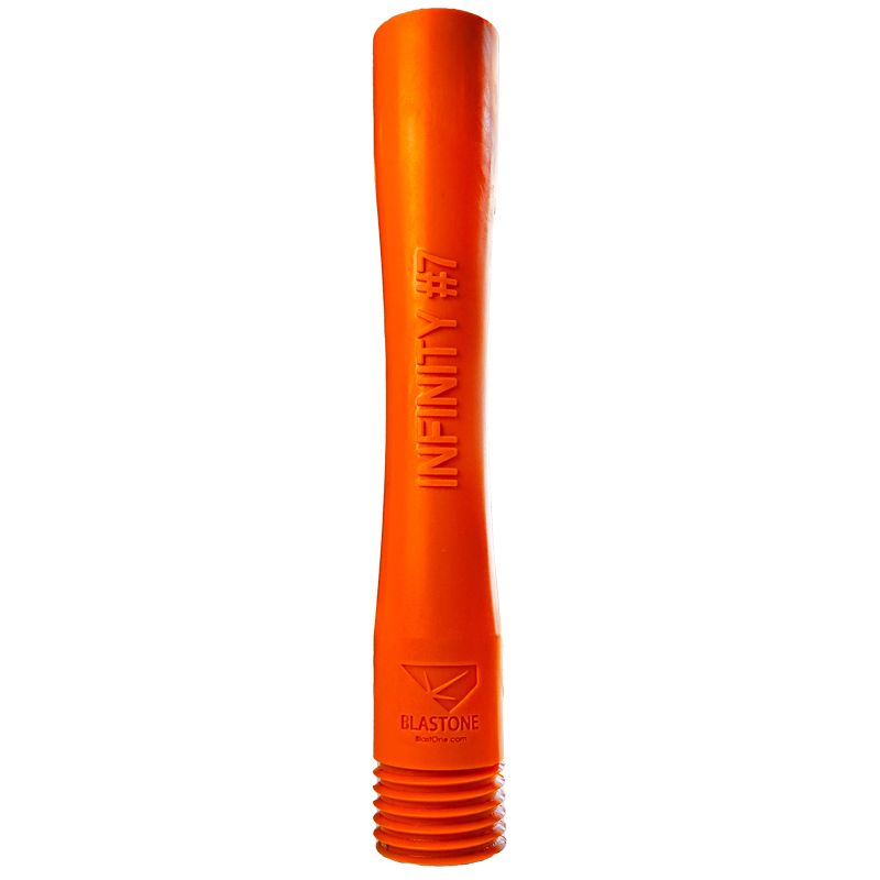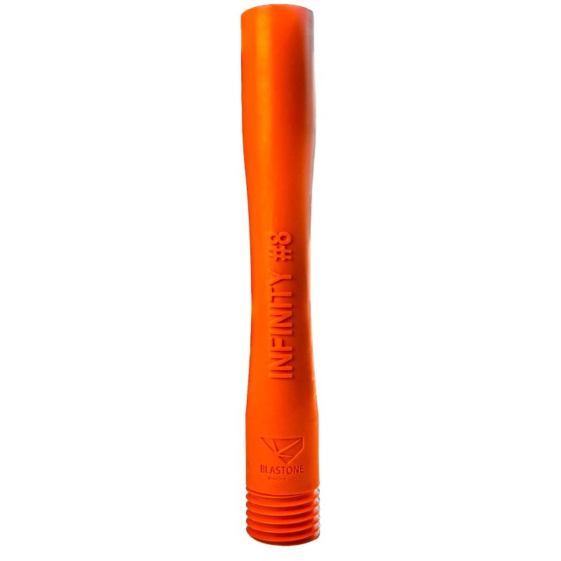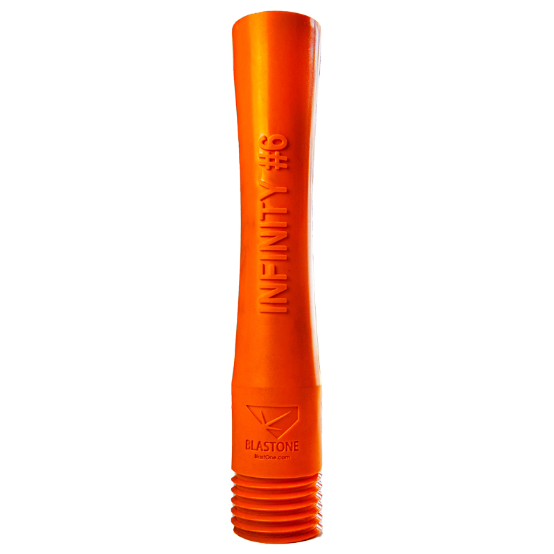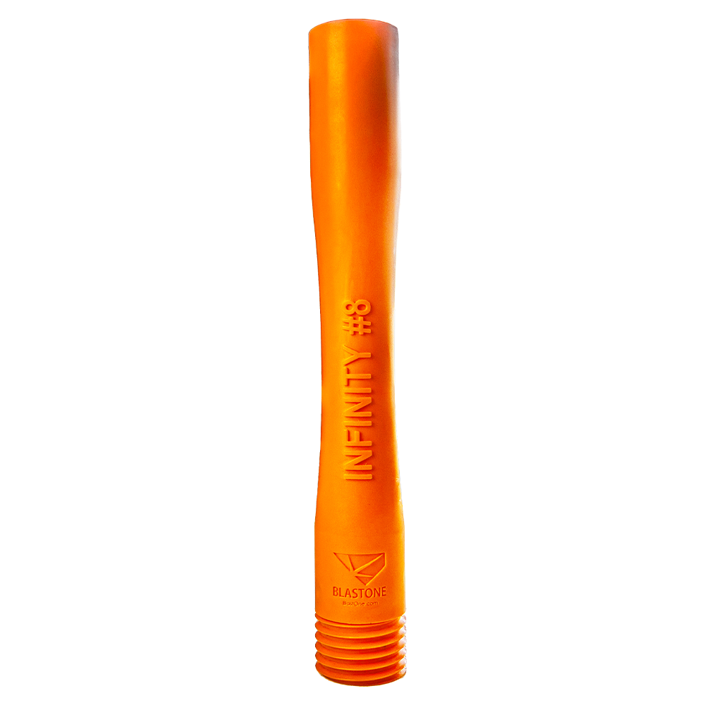 Built on the success of the groundbreaking SnakeBite nozzle, the BlastOne Infinity XL Nozzle represents the latest proprietary advancement in abrasive blasting nozzle design. Tailored for speed and endurance, this high-performance nozzle is engineered with an extended venturi profile that accelerates abrasive flow by up to 35% over standard nozzles —ideal for contractors and fabricators aiming for maximum efficiency and throughput. The Infinity XL features a space-age silicon nitride liner that uses the SnakeBite design to deliver a consistent blast pattern, reduced abrasive consumption, and an extended wear life. Its longer body, ranging from 11 to 13 inches depending on the orifice size, enhances blast speed without compromising control. With a rugged urethane outer layer and jam-resistant contractor threads, the Infinity XL blast nozzle is optimized for high-output industrial environments.- BlastOne’s latest innovation – engineered for extreme blasting speed