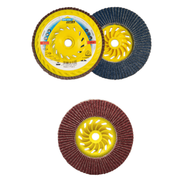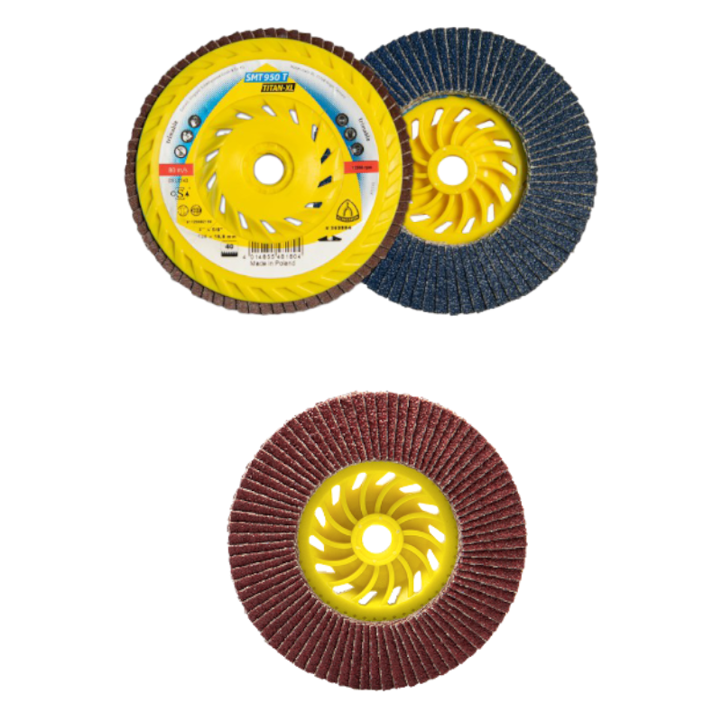 Klingspor's flap discs are engineered to meet the demands of intensive grinding tasks. Whether you're dealing with large flat surfaces or intricate curved edges, these discs provide the reliability and performance needed for tough jobs. The largest advantage of the Klingspor Titan series is the longevity of the discs compared to a standard flap disc. The unique design of the trimmable backing plate allows the user to utilize the entirety of the flaps, giving much longer life. In addition, they are designed with a quick-change 5/8"-11 threaded arbors and have a unique fan design to help the disc run cooler. What flap disc do you need? The different variations each have their distinct application advantages.- Angled vs. Flat: An angled flap disc with focus the abrasive on a smaller area than a flat disc will. Angled discs are especially suited for working edges, weld seams, and rounded surfaces. A 6° angle is the most aggressive and is best suited for flat or slight contour work. A 12° angle is perfect for more contoured work and is easier to use for less experienced users. Flat discs allow faster and more consistent work on flat surfaces.