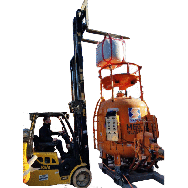 The Bulk Bag Rack for Axxiom / Schmidt Mega Bulk Blasters is a safety-forward accessory built for heavy-duty abrasive loading tasks. This optional add-on simplifies bulk bag handling while significantly enhancing job site safety. Available in three configurations—a round version for both 120CF and 160CF units, and square models sized specifically for either the 120CF or 160CF vessels—this rack helps streamline material transfer while minimizing operator fatigue and risk. The round rack (MPN: 8400-018-85) stands out with its solid round plate bottom. This low-profile design not only provides stronger structural support and a guided flow for abrasive transfer but also acts as a physical barrier between the operator and the suspended abrasive bag. Its compact design reduces the lift height required for loading, especially when compared to standard Schmidt racks. Additional built-in features include forklift pockets and height-adjustable legs, ensuring quick transport and a universal fit across setups. The square racks are available in two dedicated sizes. The 120CF version (MPN: 8400-018-84) comes in white and is tailored for precise alignment with the smaller Mega Bulk Blaster model. The 160CF version (MPN: 8400-018-73) delivers maximum support and safety for the larger vessel setup.- Available in 3 versions: square 120CF, square 160CF, round 120/160CF