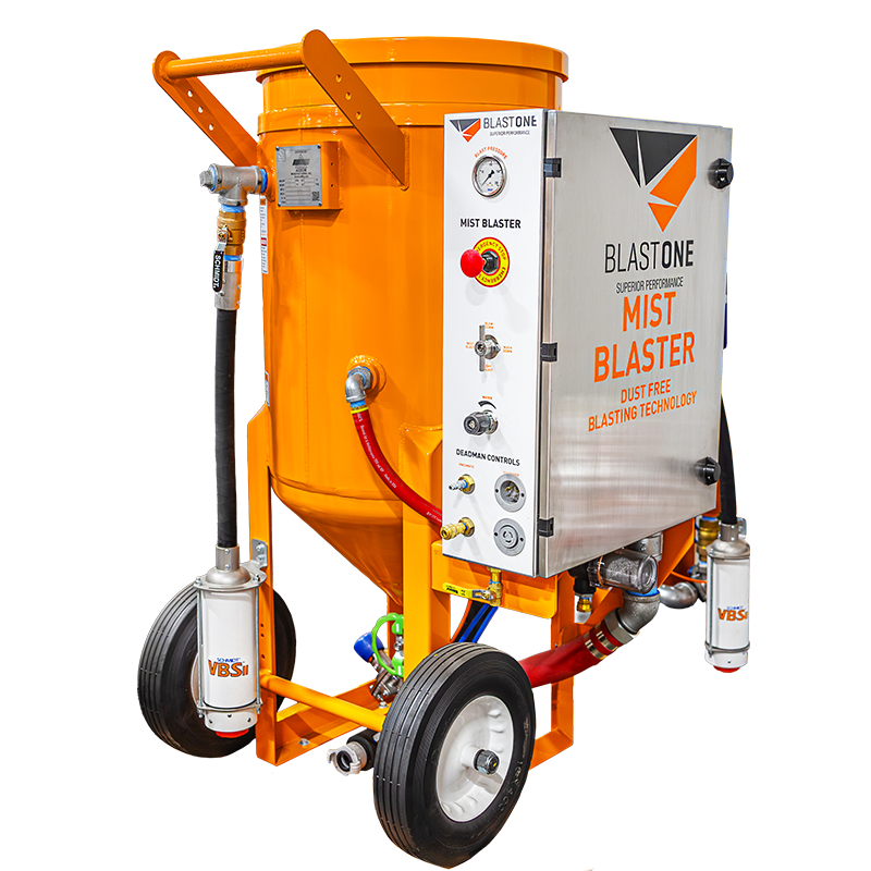 The MistBlaster® Wet/Dry Blast Machine redefines flexibility and performance in abrasive blasting with its versatile combo skid or portable with wheels configurations. Designed for contractors and industrial professionals, this cutting-edge blasting system seamlessly integrates wet and dry modes, offering unmatched versatility and productivity. Whether you need a portable solution with wheels for mobility or a combo skid setup equipped with breathing air systems or air dryers, the MistBlaster is built to adapt to your needs. Its enhanced control panel includes four operational modes—Dry Blast, Wet Blast, Wash Down, and Blow Down—providing precision control for every task. The enhanced high-flow connections minimize pressure drop (only 3 psi typical), ensuring consistent performance and optimal results. The MistBlaster excels in water efficiency, consuming as little as 1 pint per minute in MistBlast mode. Separate controls for water and abrasive flow allow for precise adjustments, maximizing productivity while keeping cleanup manageable. Compatible with most abrasives in dry mode and optimized for garnet or crushed glass in wet mode, it is the go-to solution for diverse surface preparation tasks. Available on both the popular 6.5CF single-outlet as well as a 10 CF 2-outlet chassis, the MistBlaster is engineered for durability and reliability. Choose from multiple configurations, including portable with wheels, skid-mounted, or retrofit kits for existing systems. The combo skid options allow integration of air dryers—deliquescent or squat type—and breathing air systems for enhanced functionality. Available for purchase or rental, the MistBlaster delivers value and performance for any jobsite.