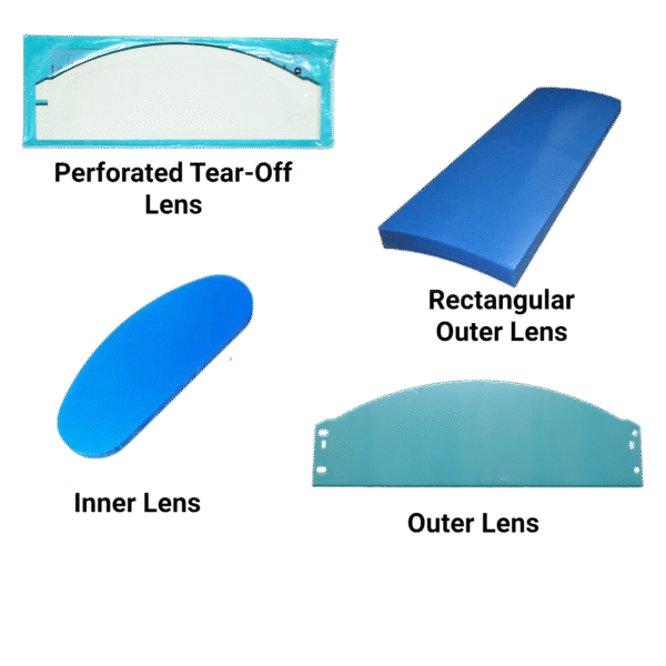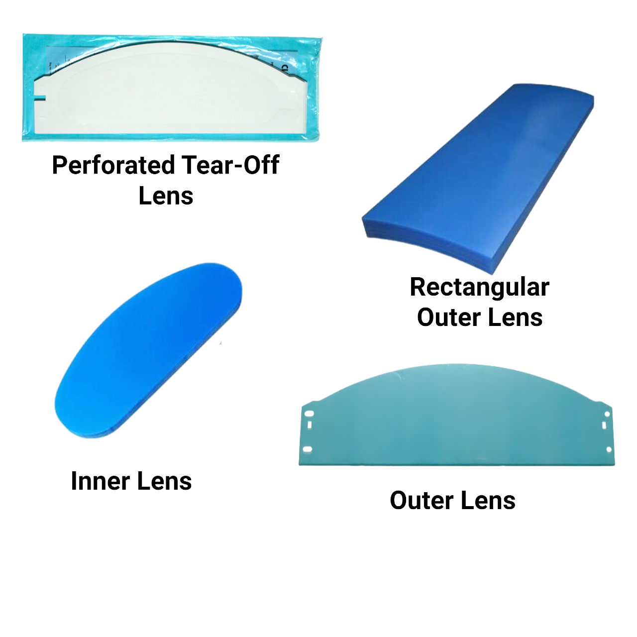 - Perforated Tear-Away Outer Lenses: The outermost lenses are designed to protect the middle lens from pitting and wear caused by abrasive blasting. Up to three perforated, tear-away outer lenses can be stacked for added convenience, allowing the operator to quickly remove a worn lens and expose a fresh one without interrupting the workflow.