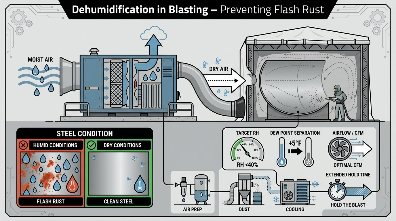 Both during and immediately after abrasive blasting, atmospheric humidity levels are critical. This is due to the blasted substrate becoming vulnerable to flash rusting. Introducing dehumidified air into an enclosed work area will help combat flash rusting. "Holding the blast" on uncoated, blasted steel is possible using de-humidification systems. For this to be successful, the humidity needs to be below 50% RH. This typically will have a huge impact on a production cycle. Imagine being able to blast non-stop for a week before having to stop, clean up and paint!