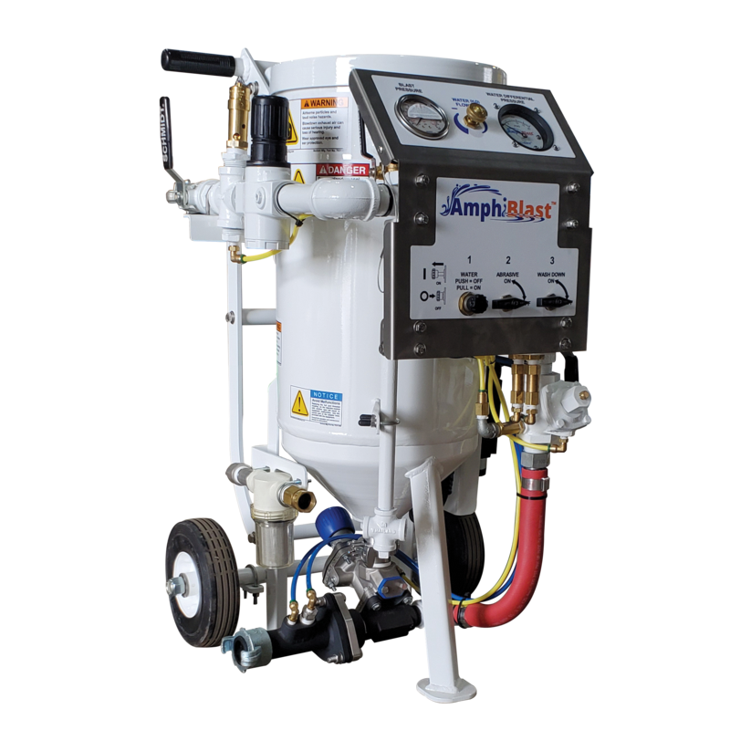 The Schmidt AmphiBlast™ Mini 1.5 cu. ft. is a highly portable, compact blasting system that provides both wet and dry blasting in one unit. As the smallest and lightest in the AmphiBlast family, it is designed for easy maneuvering into tight job sites and hard-to-access locations, offering maximum versatility and performance. Unlike traditional systems that mix water and abrasive inside the vessel (aka slurry blaster), the AmphiBlast system injects water into the blast stream after the metering valve. This design allows for fine-tuned control over the air, abrasive, and water flow, ensuring optimal blasting efficiency and minimal material waste. Operators can easily switch between wet and dry blast, blowoff, and Softwash™ modes without having to reset blasting parameters, using a centralized control panel. The system also features the Schmidt Tera Valve™ XL, ensuring precise and repeatable abrasive metering for coarse and fine media. Key Features & Benefits