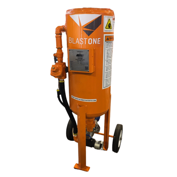 The Schmidt 0.9cf Mini Abrasive Blaster is a portable abrasive blasting system designed for professionals requiring a compact yet powerful solution for surface preparation. Don't let it's small size confuse - it's built with industrial-grade construction in a unit that is easy to maneuver and operate. This blaster features a pressure-hold TeraValve metering valve, allowing for precise control over abrasive media flow, which is crucial for achieving consistent surface profiles. The standard 3/4" piping facilitates matches the TeraValve, enhancing blasting efficiency. The choice of either Electric or Pneumatic G3 Trigger controls provide reliable remote operation, ensuring operator safety during use. The unit's manual pop-up and blowdown valves simplify pressurization and depressurization processes, reducing downtime between tasks. The included 25-foot blast hose paired with a #2 ceramic nozzle offers flexibility and durability, while the integrated screen prevents debris from entering the system, maintaining its longevity. Weighing 107 lbs and equipped with wheels, the Mini Blaster is easily transportable, making it suitable for on-site jobs and confined spaces.