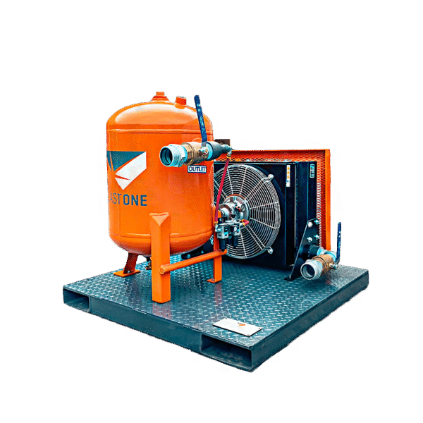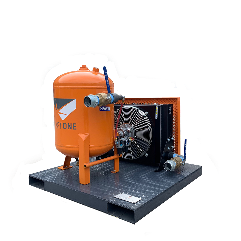The BlastOne “Squat” Aftercooler Air Dryer System removes moisture from compressed air before it reaches your blast pot. This compact, steel skid-mounted system is designed for industrial blasting operations where reliable, dry air is required for consistent performance.