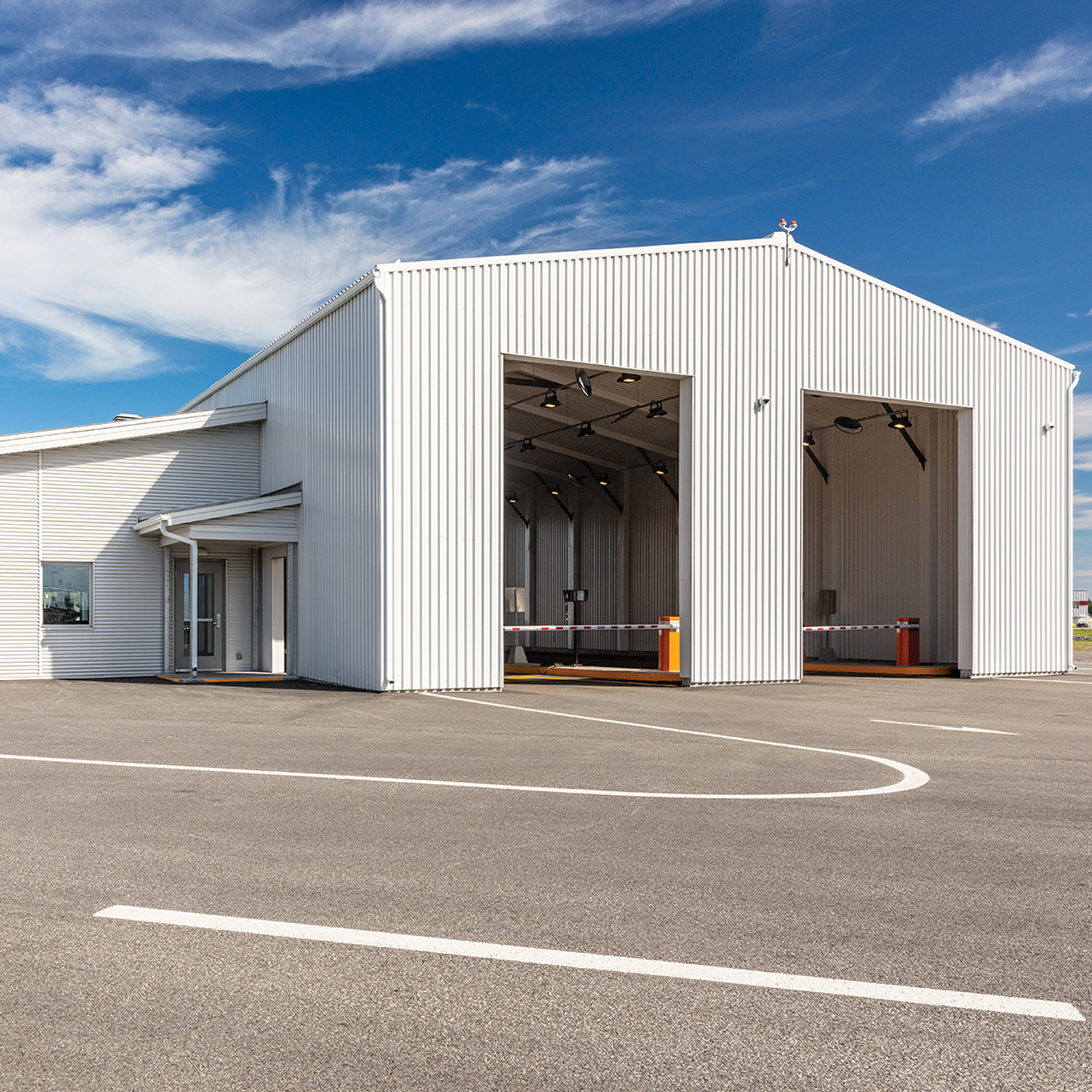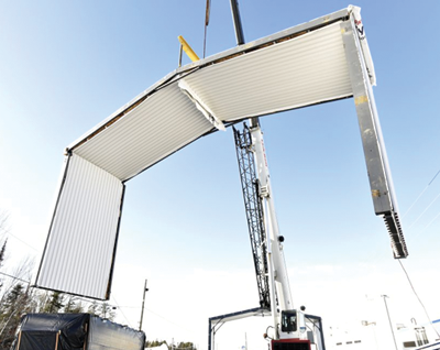 The four-panel section is placed on the foundation. Only 48 hours are needed to install the six sections of a 40 ft x 60 ft (12 m x 18 m) building.