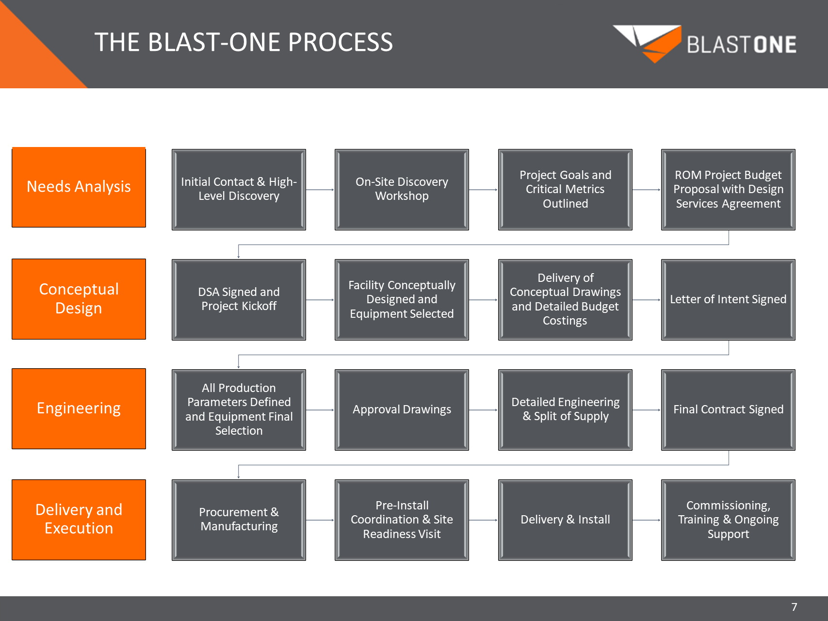 Our projects at BlastOne goes through the below process. We use this process to make sure we are completing every single project at the highest standard possible in order for our customers to build top-of-the-range facilities.
