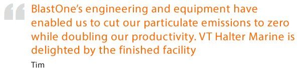 “BlastOne’s engineering and equipment have enabled us to cut our particulate emissions to zero while doubling our productivity. VT Halter Marine is delighted by the finished facility.” – Tim Pryor, Facilities Manager of VT Halter Marine